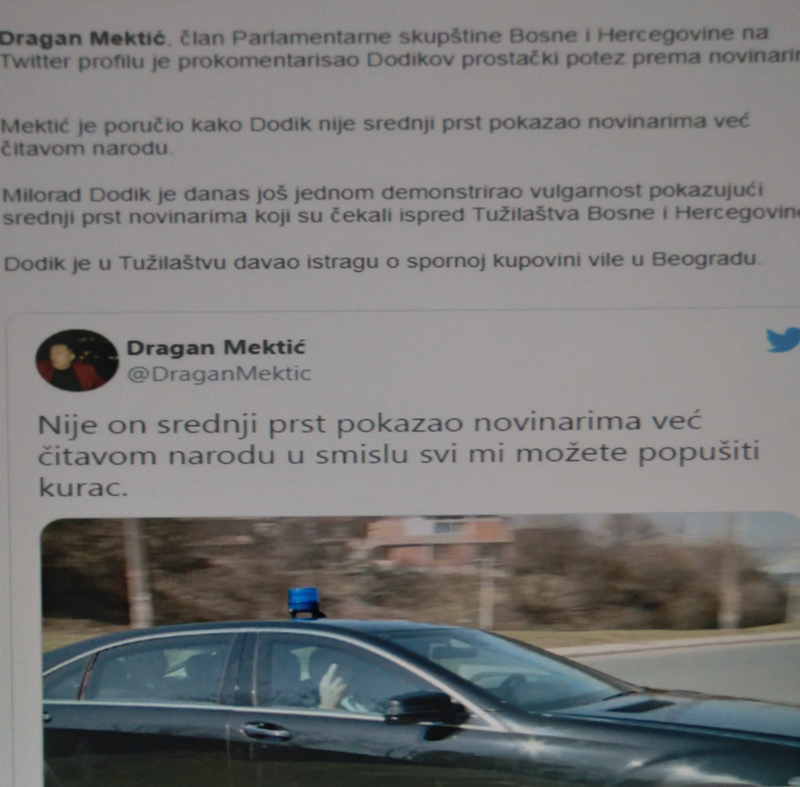 Drugo, skoro svi mediji koji su osudili ovaj potez Dodika i njegovu ‘vulgarnost’ i ‘sramotu’ potkrijepili su ali u pozitivnom ‘twittom’ Dragana Mektića, ministra i političara. Koji ne mora bit nužno netačan ali je po meni sraman i bestidan, pa ako ćemo pravo i vulgaran, vulgarnji od srednjeg prsta Dodika. Ovako je Mektić ‘twittnuo’ uz sliku Dodika u autu a skoro svi mediji to sa sipatijama i odobravanjem prenijeli, ružeći Dodika. Cititram: ‘Nije on srednji prst pkazao novinarima već čitavom narodu u smislu svi mi možete popušiti kurac’.