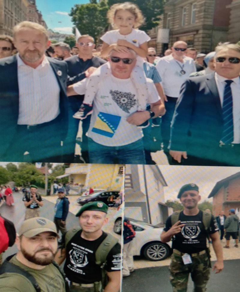 photo : Bakir Izetbegović i Željko Komšić u dijaspori na ‘maršu mira’ 09. 07. 2022 u Njemačkoj, Stuttgart, žale žrtve Srebrenice i sakupljaju glasove-gore, dolje: militantni provehabijski ‘Antidaytonci’ na ‘maršu mira’ u blizini Srebrenice, arhiv