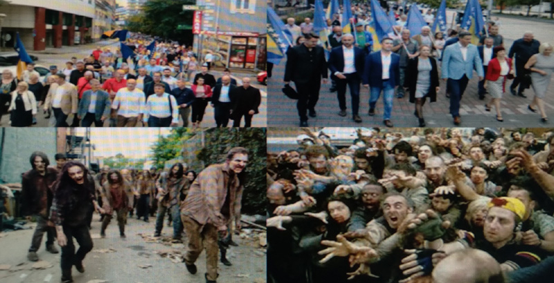 photo : gore – slike posjeta Denisa Bećirevića gradovima BiH, dolje – scene iz zombie filmova, sličnost je uočljiva, arhiv