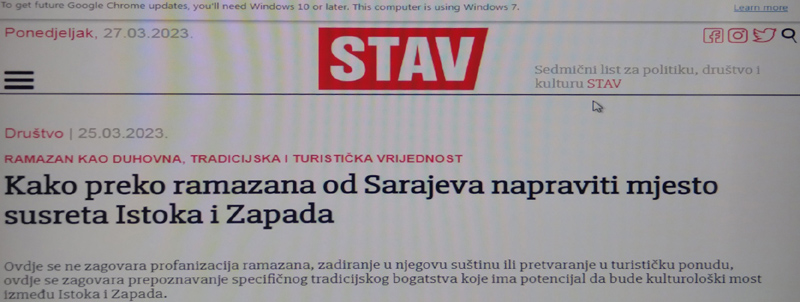 Glavni urednik ‘preletač’ i ‘pobegulja’ iz Hrvatske gdje je osumnjičen za zloupotrebu sredstava tamošnje također ‘brendirane’ firme ‘Merhamet’ Filip Mursel Begović se u zadnjem uvodniku pored ‘senzacionalnog’ intervjua sa nosiocem crne američke liste i razriješenim direktorom OSAe ‘Osmicom Mehmedagićem (u kojem osim već poznatih navoda ‘političkog progona Amerike i Zapada’ što smo čuli od ranije, ništa nije senzacionalno izuzev navodna četiri atentata na Aliju Izetbegovića), nudi nam najnoviju ideju : brendirati Ramazan kao tursitičku atrakciju.