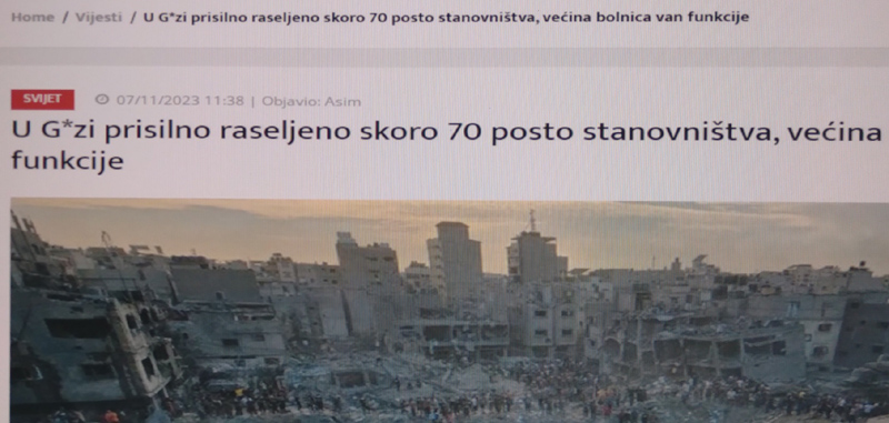 Čitam tako na krajiški medijima ovih dana i vidim da je Cazin.net cenzuru i ljepotu čistoće shvatio preozbiljno pa naslovi glase ovako. ‘U G*zi prisilno raseljeno skoro 70 posto stanovništva, većina bolnica van funkcije’ ili ‘SAD donirale puške Izr*elu uz jedan uslov: Ne smiju ih dobiti doseljenici na Zapadnoj obali’. Tu je u tekstovima Hamas postao H*amas’ i ovakvo gutanje slova zvijezdicom prelazi u pravo pismeno davljenje. Neću ni da pomislim da ovim pisanjem, zapravo kopiranjem jer se radi o tekstovima sa drugih medija gdje naslovi naravno nemaju zvijezdice, ‘Gaza’ u mozgu domišljatog čitača može postati (gluho bilo) ‘Guza’ ili ‘Giza’, ili još mnogo toga u velikom izboru znakova pokrivenih zvijezdicom, samo treba pronaći odgovarajuće slovo. Na isti način sudbinu čeka i Hamas i Izrael