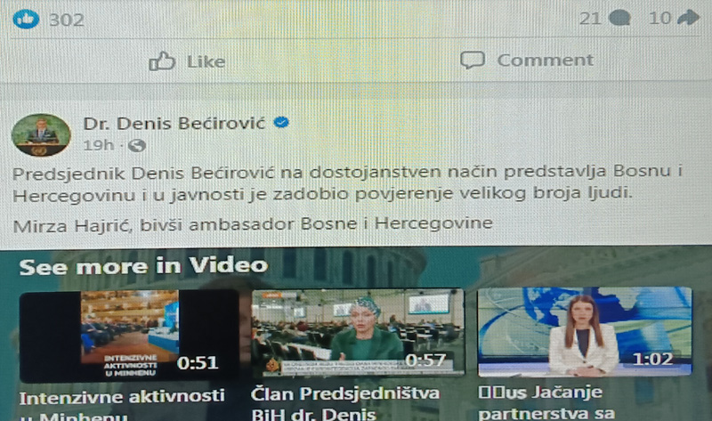 Vjeruje se da se u njegovim silnim pisanjima po čemu je opštepoznat i odranije i od sada pa u buduće tako i legitmiše, tako se i ponaša. Nakon što ga je ekipa ‘trojke’ posadila u stolicu bh Predsjedništva, on se načisto ‘odvezao sa lanca’. Radi po svome i samo u interesu svoje SDA bratije i Reisa, hinjeći SDP ‘komunistu’ i tobože ljevičara. Brat Komšić zorno pripomaže. Predsjednički se ponaša i kad putuje, sve je u VIP aranžmanu, od aerodroma do skupih hotela. Prije neki dan je svoju titulu uturio i na zvanični ‘facebook profil, kroz izvještaj o ‘njegovim uspjesima ‘ u diplomatiji, uz tekst i video bivšeg bh ambasadora Mirze Hajrića. Čime nam je Denis osvanuo kao predsjednik.