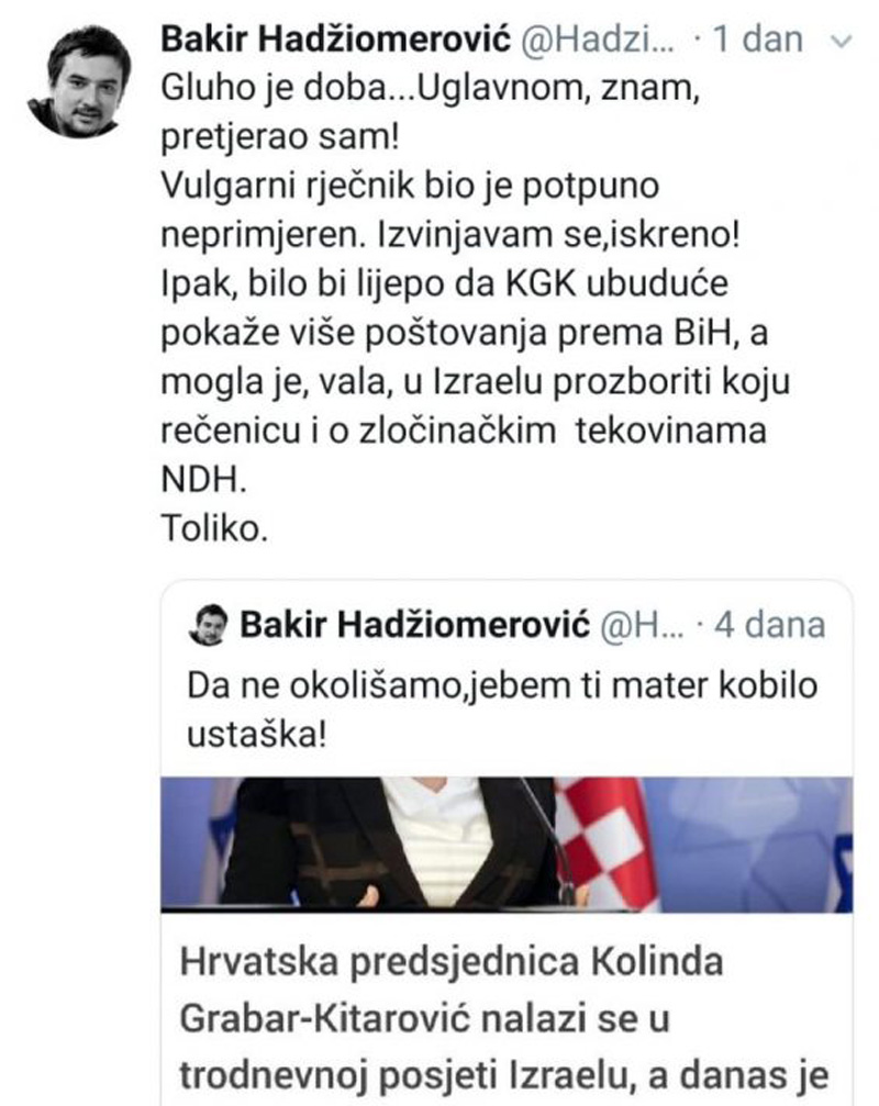 Nije rijedak slučaj u BiH da su novinari prostaci i javni primitivci. Sjetimo se samo Emira Suljagića nekadašnjeg novinara pa ministra SDPa sadašnjeg uzoritog džematlije i šefa u Potočarima kada je tužiocima BiH jebo mater na instagramu nezadovoljan njihovim ne poduzimanjem akcija po prijavama. Mater je krehn’o ne samo njima već i hrvatskom predsjedniku Milanoviću pa i čitavom njegovom uredu na Pantovčaku, pročitavši njegovu neprovjerenu izjavu na summitu na Bledu u vezi genocida. Po čemu je pored Suljagića još poznatiji po tom i vlasnik privatne pričaonice tv ‘Face’ Senad Hadžifejzović. On je kao uzoriti hadžija i džematlija 2020. ovako pozdravio hrvatskog rpredsjedniak Zorana Milanovića 2020. godine.